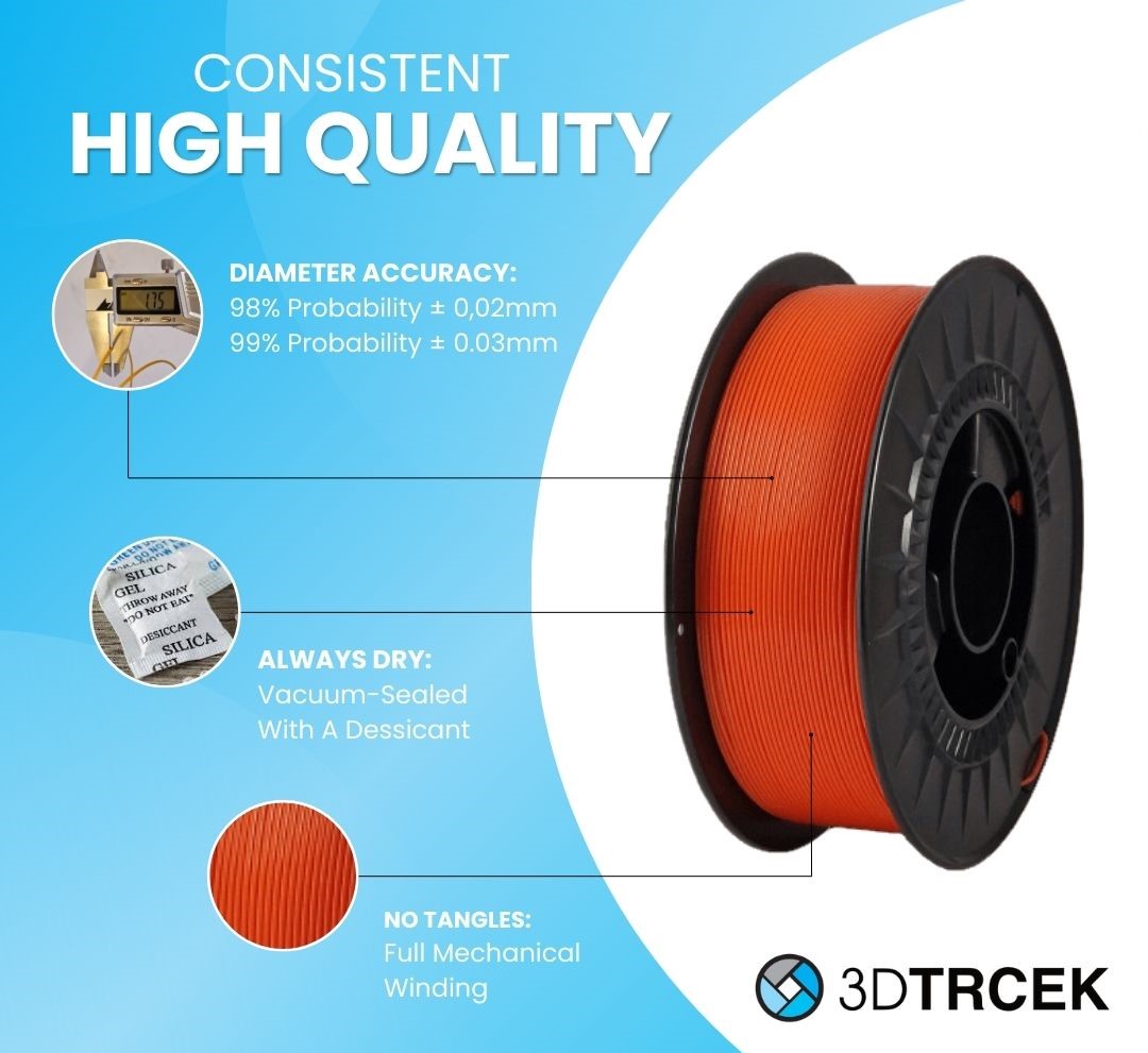 3DTrček PLA filament pridonosi izvrsnoj kvaliteti površine, stvarajući dosljedne i pouzdane rezultate. Jedan je od najčešće korištenih materijala, osobito za kućnu primjenu 3D printanih modela. PLA je biorazgradiv te se dobiva iz obnovljivih izvora kao što je kukuruzni škrob, šećerna trska, pa čak i krumpirov škrob. Zbog toga je vrlo ekološki u odnosu na druge materijale (ABS ili PVA). Vrlo često se koristi u medicini za implantate u tijelu, za pakiranje hrane i jednokratan pribor za jelo.