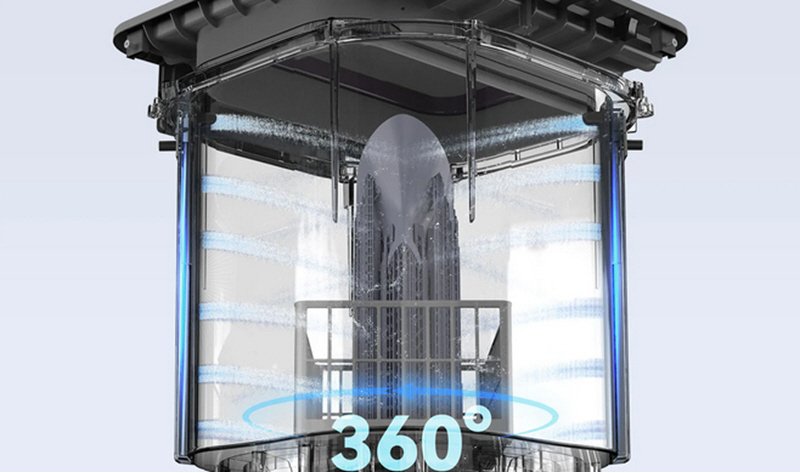Primjena dvaju potpuno novih načina ispiranja – prskanjem i detaljnim potapanjem – osigurava učinkovito i temeljito čišćenje. Snažna mehanička injekcija 360° uklanja ostatke smole s površine modela, dok donje potapanje omogućuje temeljito ispiranje i iz teško dostupnih detalja.
