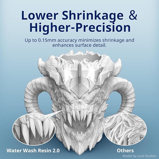 - Anycubic Water Wash Resin 2.0 postiže komplicirane detalje s preciznošću do 0,15 mm, što je savršeno za minijaturne modele. Niska stopa skupljanja osigurava visoku točnost i konzistentnost vaših modela, čak i u hladnijim okruženjima (15°C-20°C).