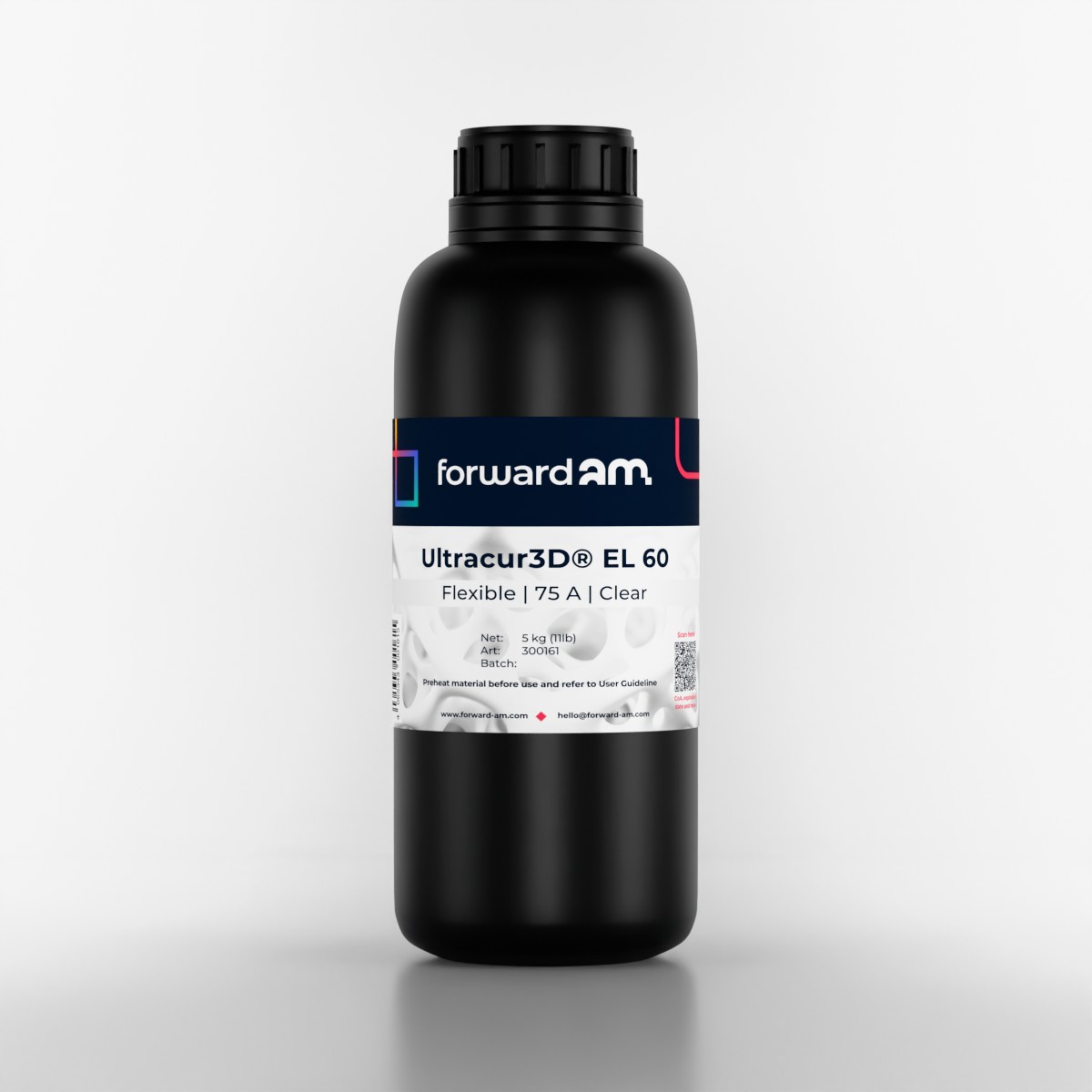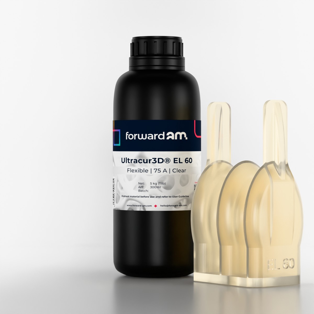 Ultracur3D® EL 60 tvrtke Forward AM je vrlo svestran reaktivni uretanski fotopolimer za visokoelastične primjene, koji kombinira vrlo dobru torzijsku čvrstoću i istezanje pri pucanju s visokom mekoćom (Shore 75 A) i niskom apsorpcijom vode. Gotovo da ne pokazuje kompresijsko stvrdnjavanje tijekom vremena i vrlo ga je lako tiskati.