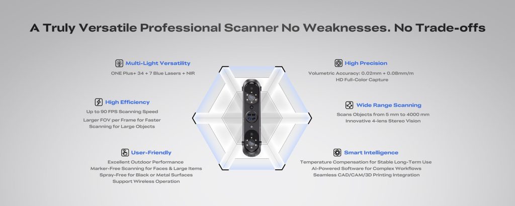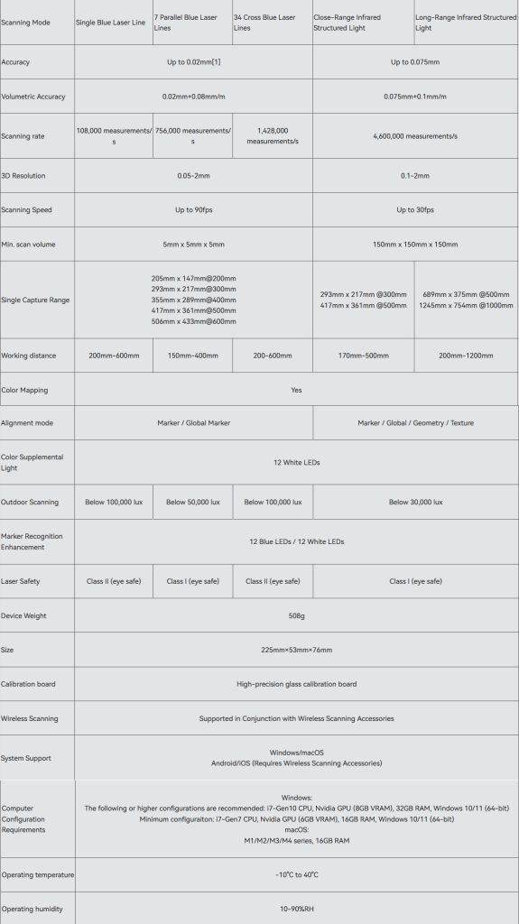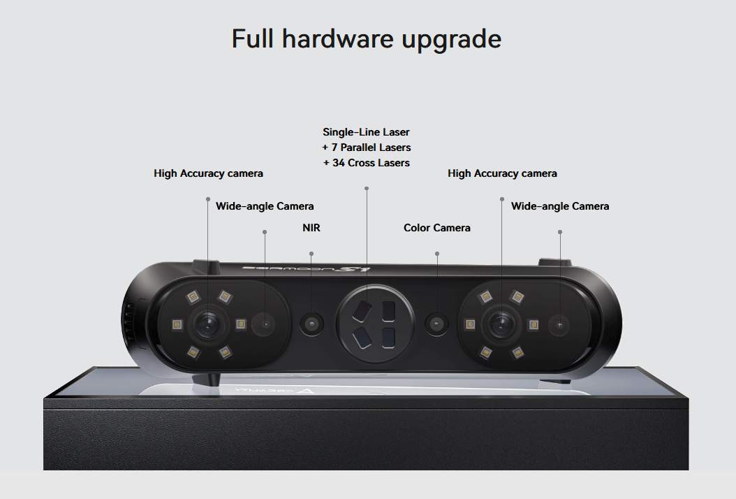 Creality Sermoon S1 integrira inovativnu kombinaciju izvora plavog lasera i infracrvenog svjetla, pokrivajući skeniranje malih, srednjih i velikih objekata. 1 + 7 + 34 plave laserske linije + NIR (infracrveno svjetlo). Omogućuje precizno skeniranje u svim uvjetima, od najmanjih do vrlo velikih objekata.