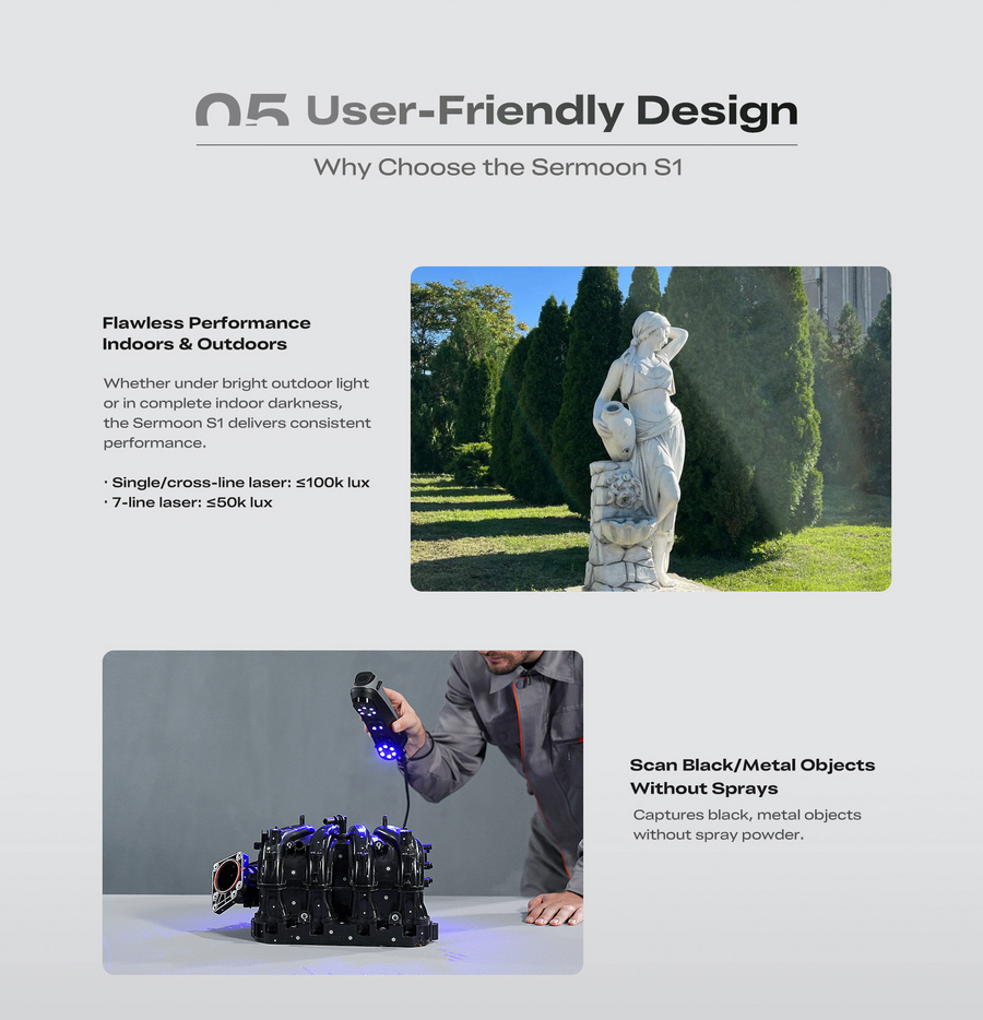 Opremljen preciznim plavim laserskim zrakama i optimiziranim optičkim putanjama, Sermoon S1 briljira pri skeniranju dubokih rupa, uskih pukotina i udubljenih područja – bilježeći najsitnije detalje s beskompromisnom preciznošću.