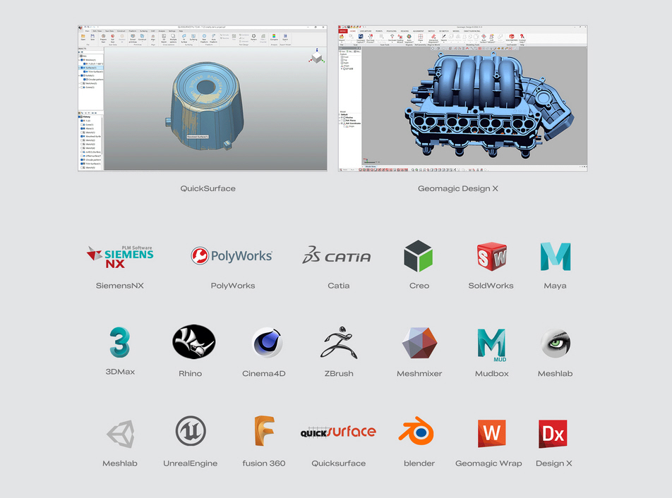 QuickSurface, Geomagic Design X, Siemens NX, PolyWorks, Catia, Creo, SolidWorks, Maya, 3D Max, Rhino, Cinema4D, ZBrush, Meshmixer, Mudbox, Meshlab, Unreal Engine, Fusion 360, Blender itd.