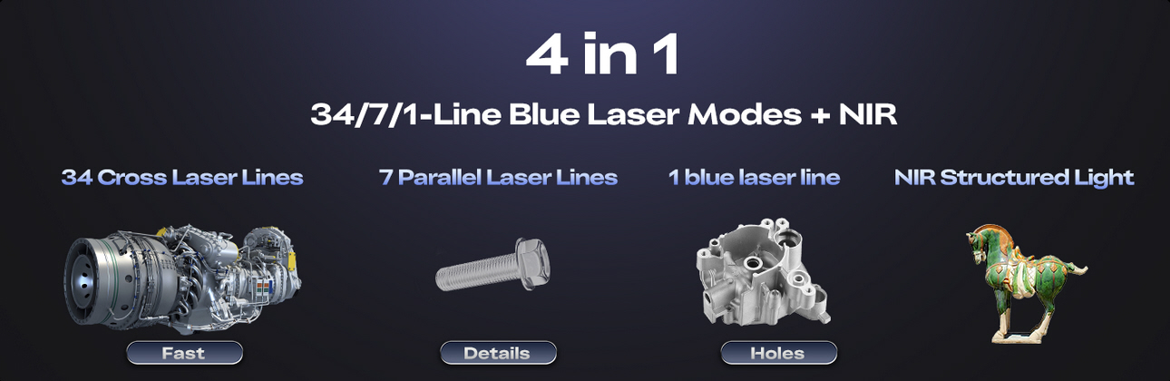 Kombinirani sustav od jedne linije + 7 + 34 koristi plave laserske linije i NIR strukturirano svjetlo koje omogućava visoko precizna skeniranja u svim svjetlosnim uvjetima.