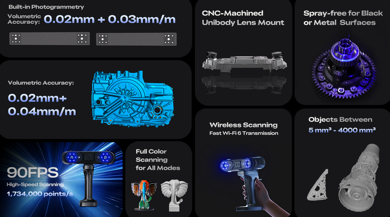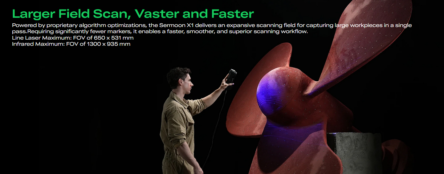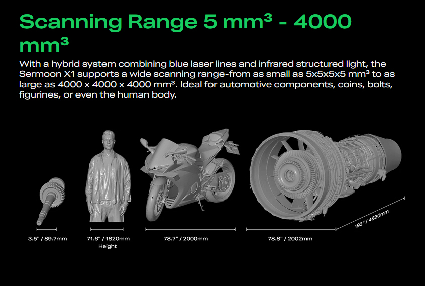 S hibridnim sustavom koji kombinira plave laserske linije i infracrveno strukturirano svjetlo, Sermoon X1 podržava širok raspon skeniranja – od malih dimenzija kao što su 5 × 5 × 5 mm³ do velikih kao 4000 × 4000 × 4000 mm³. Idealan za automobilske dijelove, kovanice, vijke, figurice ili čak ljudsko tijelo.