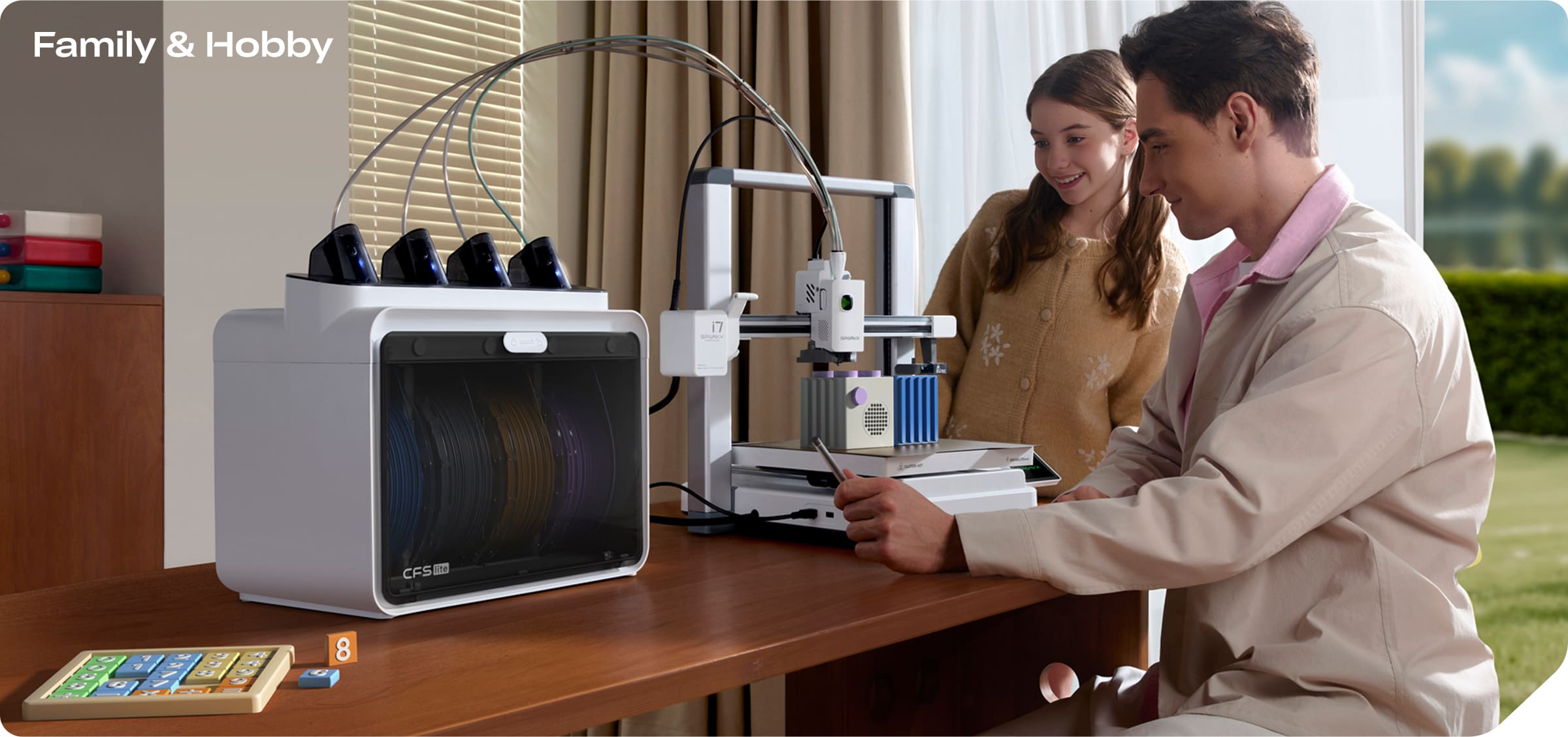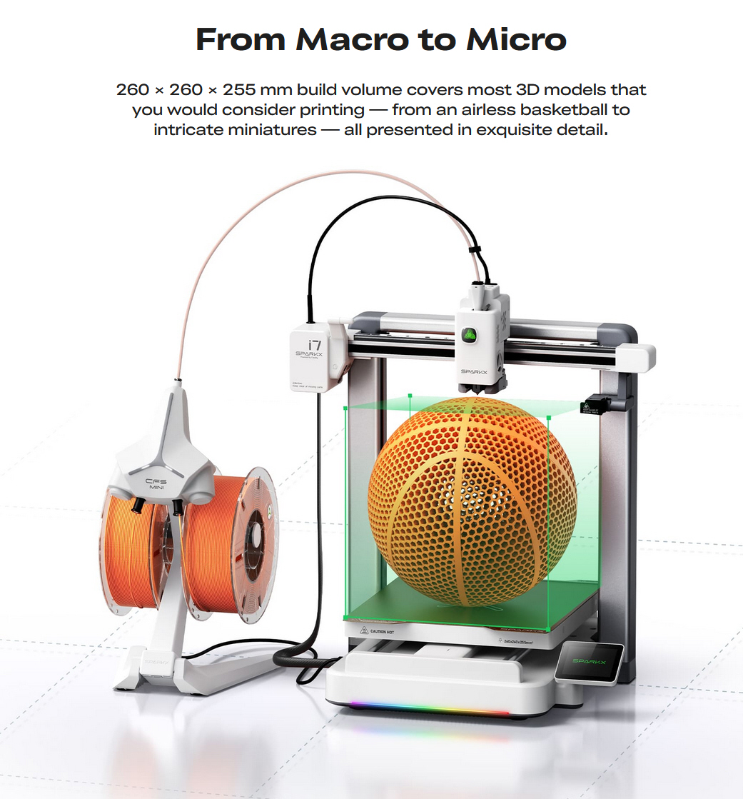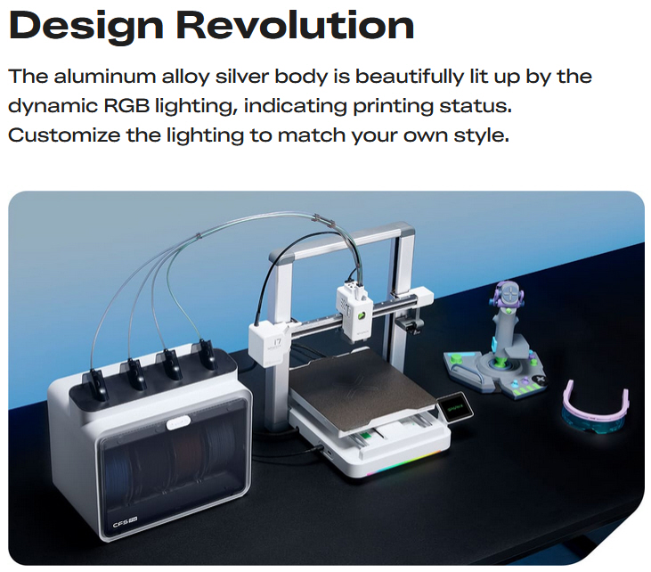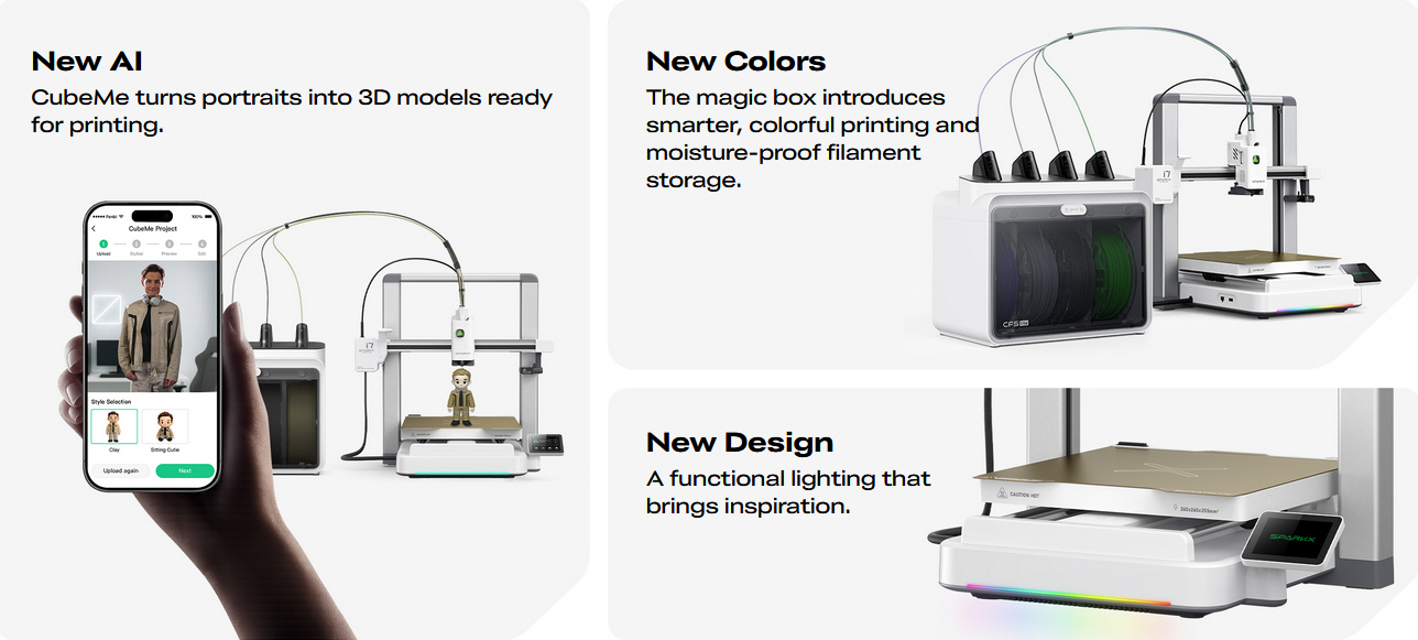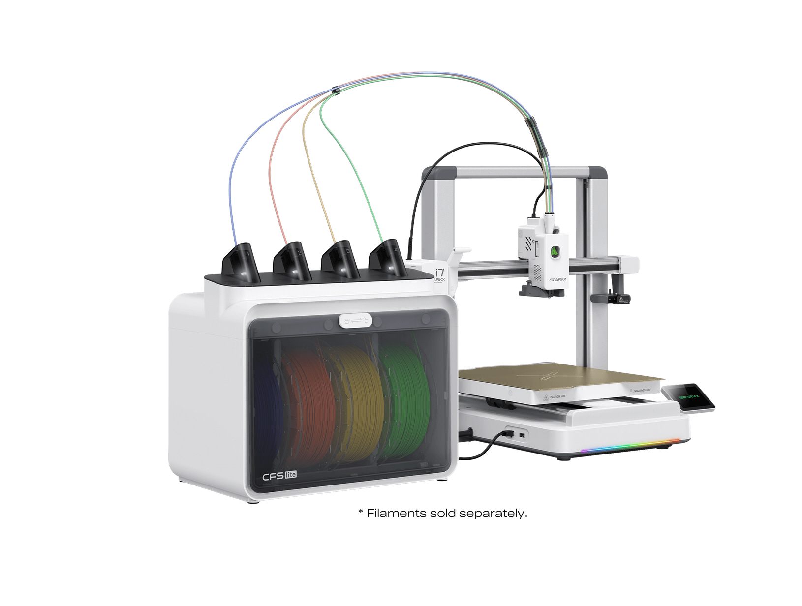 3D printer sa sa CFS Lite sustavom za printanje u više boja, brzina printanja do 500 mm/s. Volumen printanja 260×260×255 mm i temperatura printanja do 300℃. Uz brojne AI detekcije pruža jednostavan i pametan sustav printanja FFF tehnologijom.
