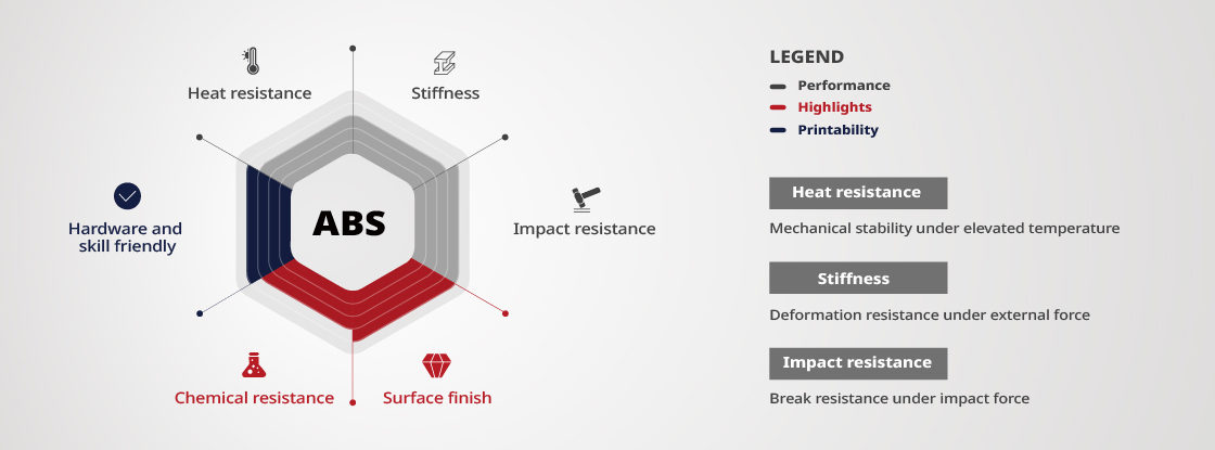 Raise3D ABS je termoplastični filament za 3D printanje koji je pouzdan, čvrst i otporan na udarce. Također, ima veću dimenzijsku stabilnost i kemijsku otpornost. Navedene značajke čine ga pogodnim za primjenu u inženjerstvu, strojarstvu, izradi prototipova, konceptualnih modela, alata i opreme, ispitivanju funkcija i sastavljanju dijelova.