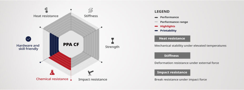 Raise3D PPA CF filament predstavlja industrijski filament od naprednih industrijskih termoplastika koje su izuzetno žilave, izdržljive i odlikuju se velikom čvrstoćom. PPA je poznat po velikoj udarnoj čvrstoći i često se koristi za proizvodnju krutih dijelova. PPA CF također ima veliku otpornost na toplinu, što ga čini savršenom zamjenom za metale u okruženjima s visokim temperaturama.