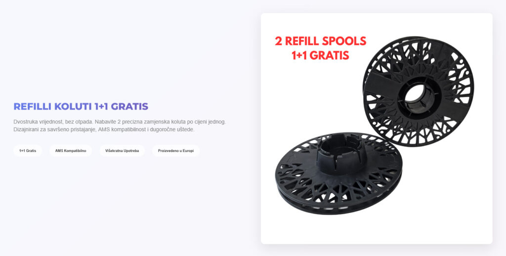 Umorni ste od bacanja praznih koluta? Naši Refill koluti precizno su izrađeni za nultu nestabilnost, savršeno pristajanje i dugotrajnu izvedbu. Iskoristite ponudu dva za cijenu jednog. Kompatibilno s Bambu Lab kolutima i AMS-om.