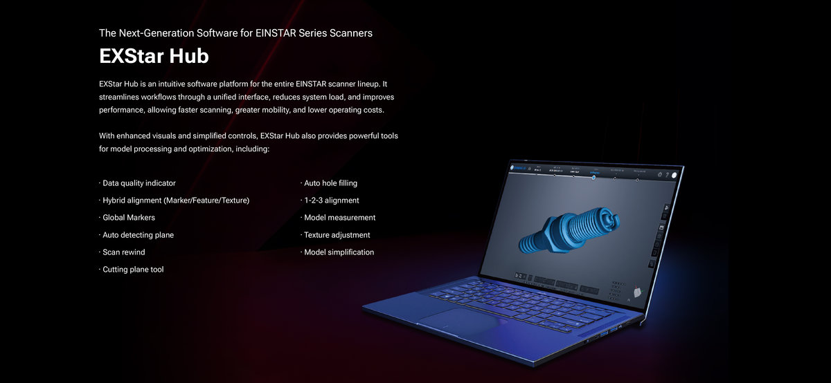 Program sljedeće generacije – EXStar Hub – je intuitivna programska platforma za EINSTAR Rockit i EINSTAR 2 3D skener. Pojednostavljuje tijekove rada putem jedinstvenog sučelja, smanjuje opterećenje sustava i poboljšava performanse, omogućujući brže skeniranje, veću mobilnost i niže operativne troškove.